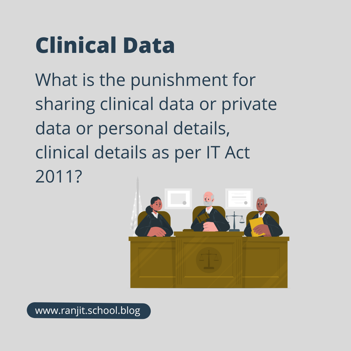 According to the rules, any unauthorized sharing, disclosure, or misuse of sensitive personal data or information can have legal consequences. The punishment for sharing clinical data, private data, or personal details in violation of the Information Technology (Reasonable Security Practices and Procedures and Sensitive Personal Data or Information) Rules, 2011, can include: